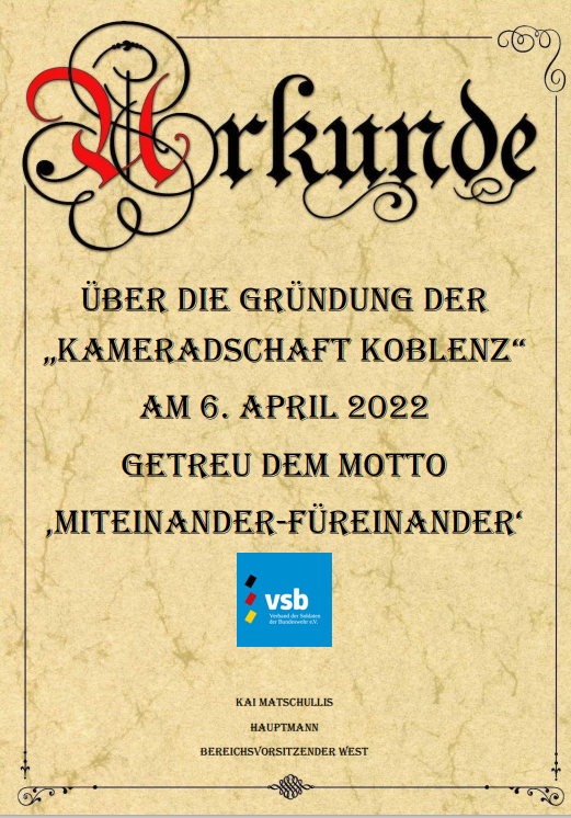 Schlag auf Schlag vergrößert sich der VSB und wird nun auch in Koblenz eine offizielle Adresse haben. Am 6. April 2022 gründete sich die Kameradschaft Koblenz und wird nun auch direkt hier sich um die Belange der Soldatinnen und Soldaten kümmern. Als direkte Ansprechstelle sind sie da, ganz im Sinne des VSB: Miteinander – Füreinander. Der Vorstand in Koblenz setzt sich aus StFw Benjamin Rost, Hptm Arndt Gladen, Oberstlt i.G. Ingo Neuber und HptBtsm Benny Rudloff zusammen, die sich auf die Dienststellen BwZK, KdoSan und BAAIN verteilen. So ist eine Ansprechbarkeit am gesamten Standort gesichert. (KM)