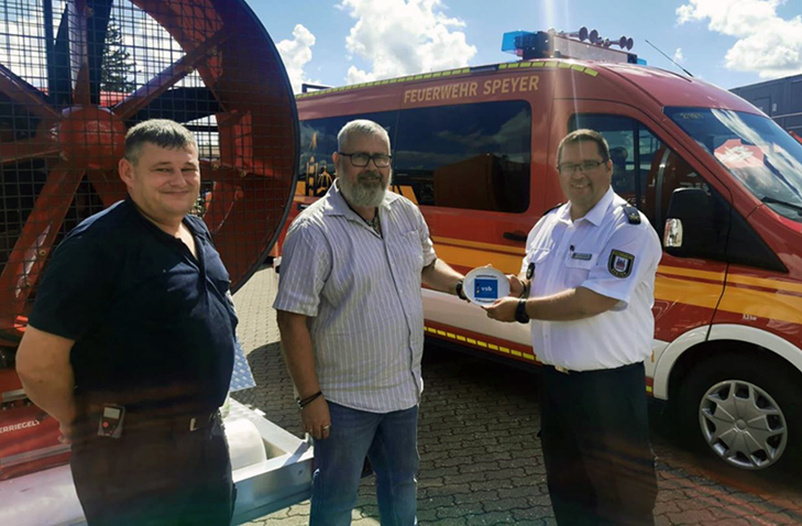 (Bild von li. nach re. Wachabteilungsführer Rolf Gieser, Hauptmann Kai Matschullis, Brand- und Katastrophenschutzinspekteur Speyer; Brandrat Peter Georg Eymann)